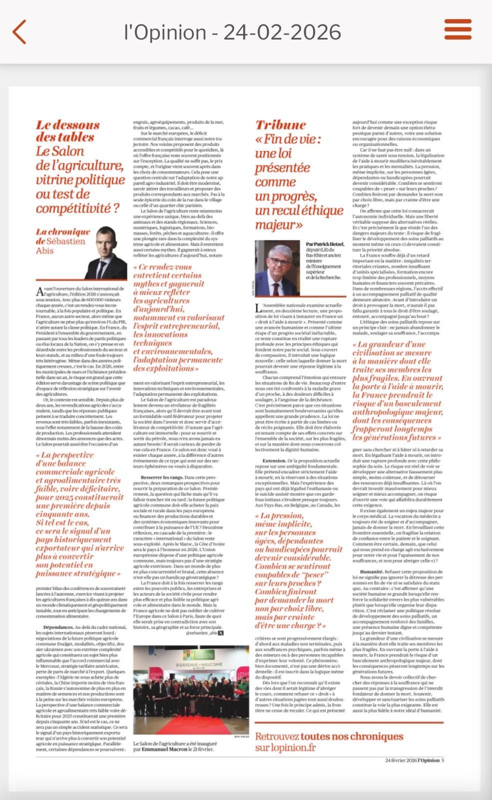 Tribune dans l'Opinion du 24 février 2026 "Fin de vie : une loi présentée comme un progrès, un recul éthique majeur"